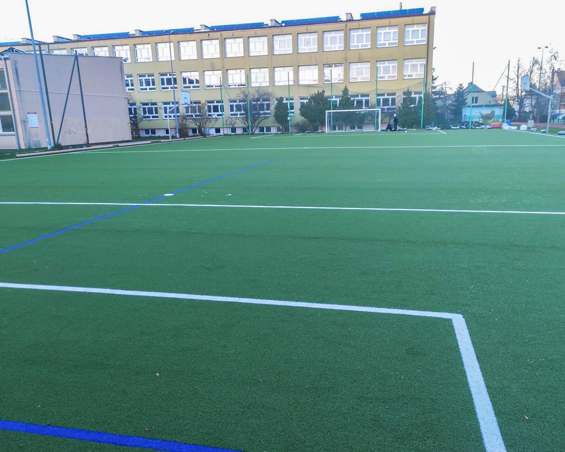 W ramach zadania wykonano nową nawierzchnię z trawy sportowej oraz wymieniono piłkochwyty i obręcze do koszykówki.